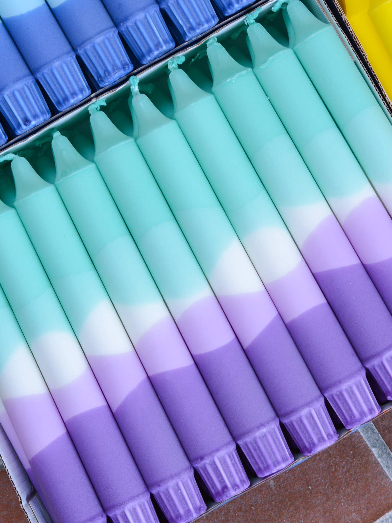 A mix of originally hand decorated 20 cm high table candles in pastel and bright summer colors. This colour combination is inspired by the "Lavender Matcha" drink.