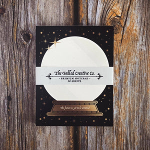 With beautiful black, soft white & antique copper colours this enchanting little notepad features our original crystal ball illustration and is perfect for all your sketching, random thoughts and insightful predictions! With smooth and sturdy pages made from 100% recycled paper, you’ll find your writing instrument of choice will glide across the surface with ease!