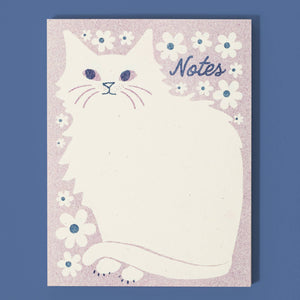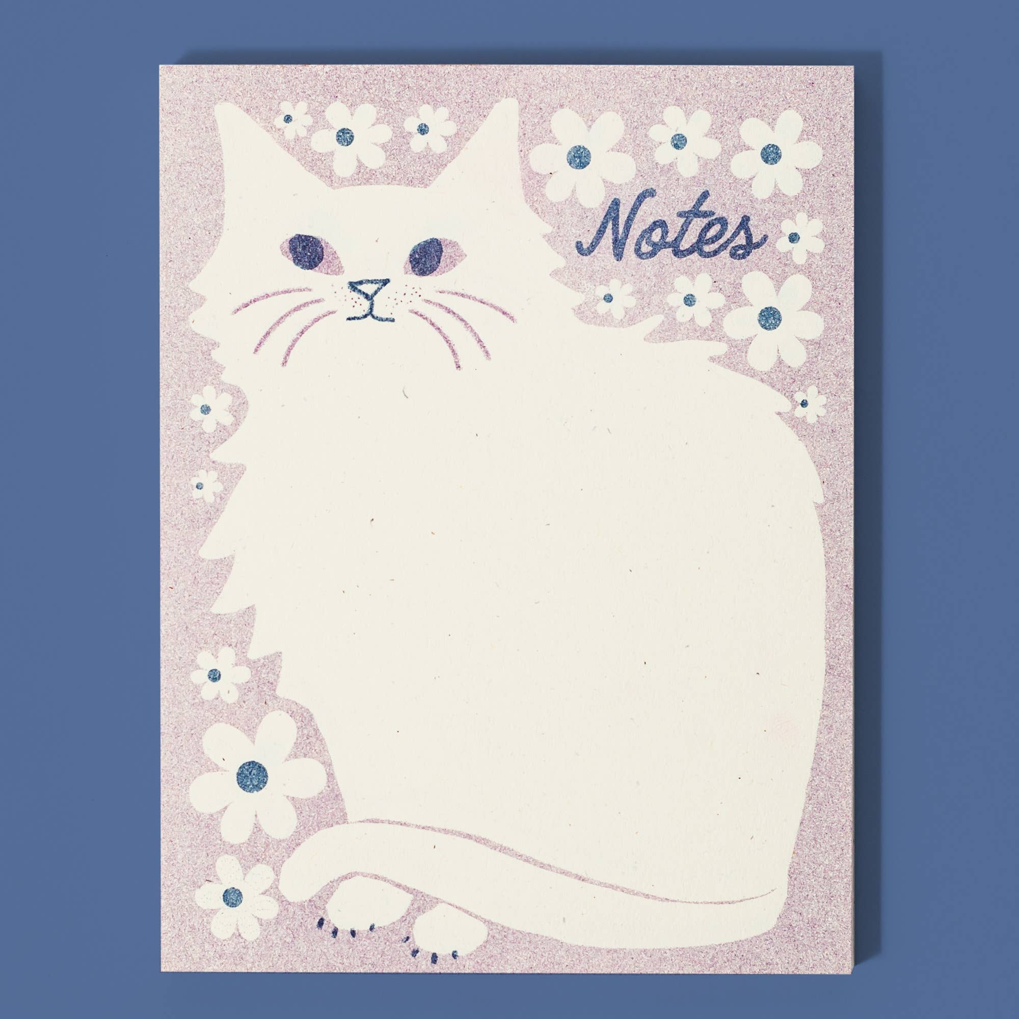 These new A2 size pads are just the right dimensions for notes to grab and go with, featuring a chonky kitty framed by flowers. 52 colorful tear-off sheets on a chipboard backer, perfect for writing cute little notes. Risograph printed in plum and federal blue.