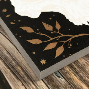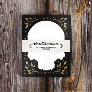 With beautiful black, soft white & antique copper colours this deadly little notepad features our original skull illustration and is perfect for all your notes, sketches and random thoughts! With smooth and sturdy pages made from 100% recycled paper, you’ll find your writing instrument of choice will glide across the surface with ease!