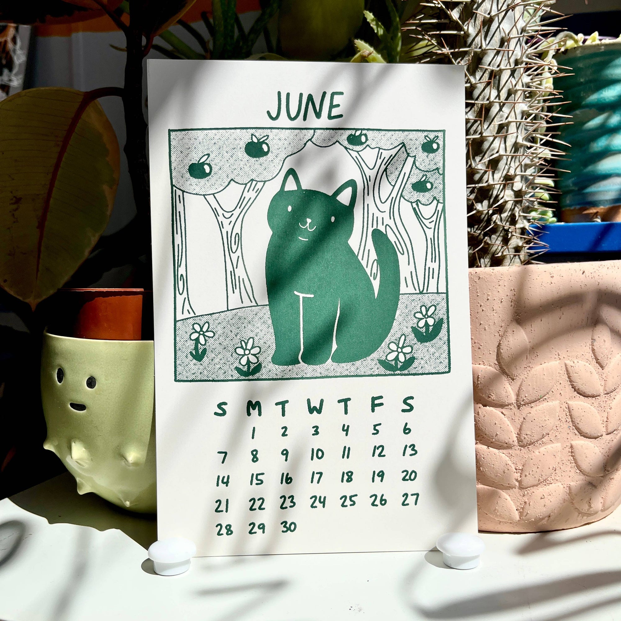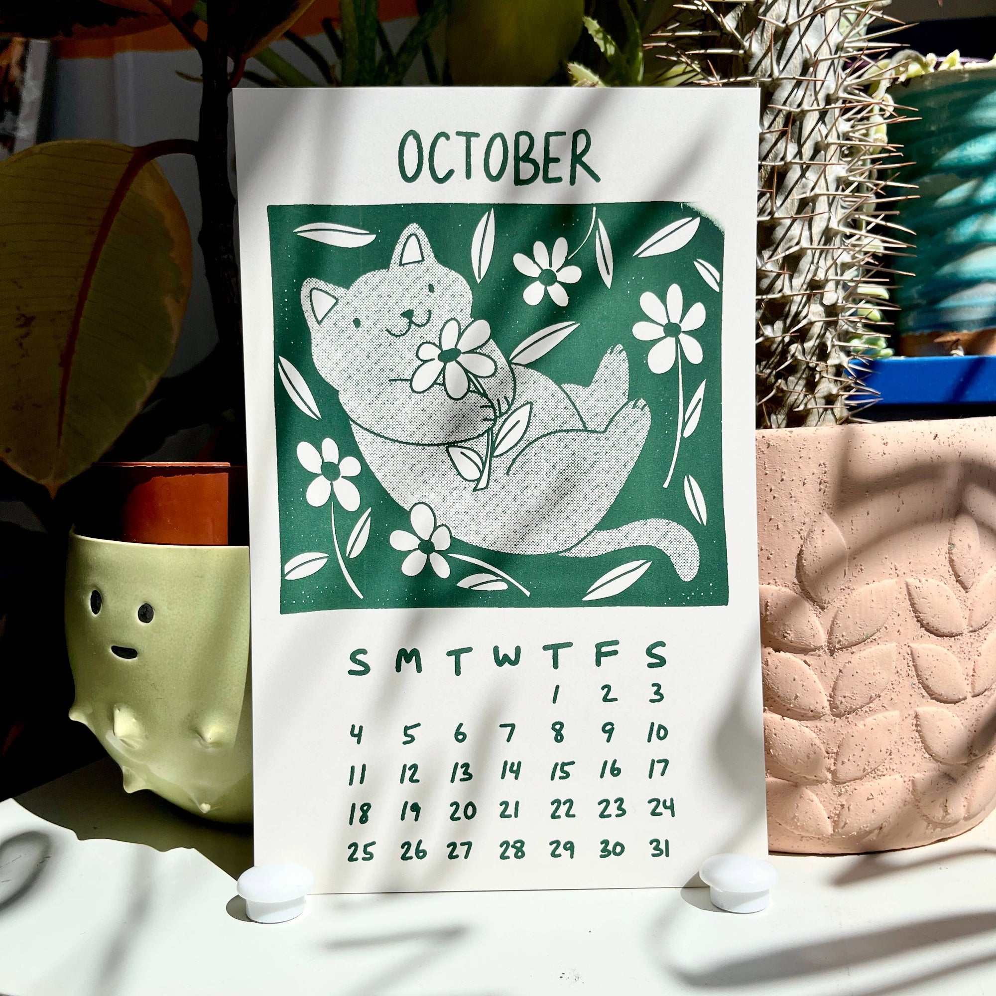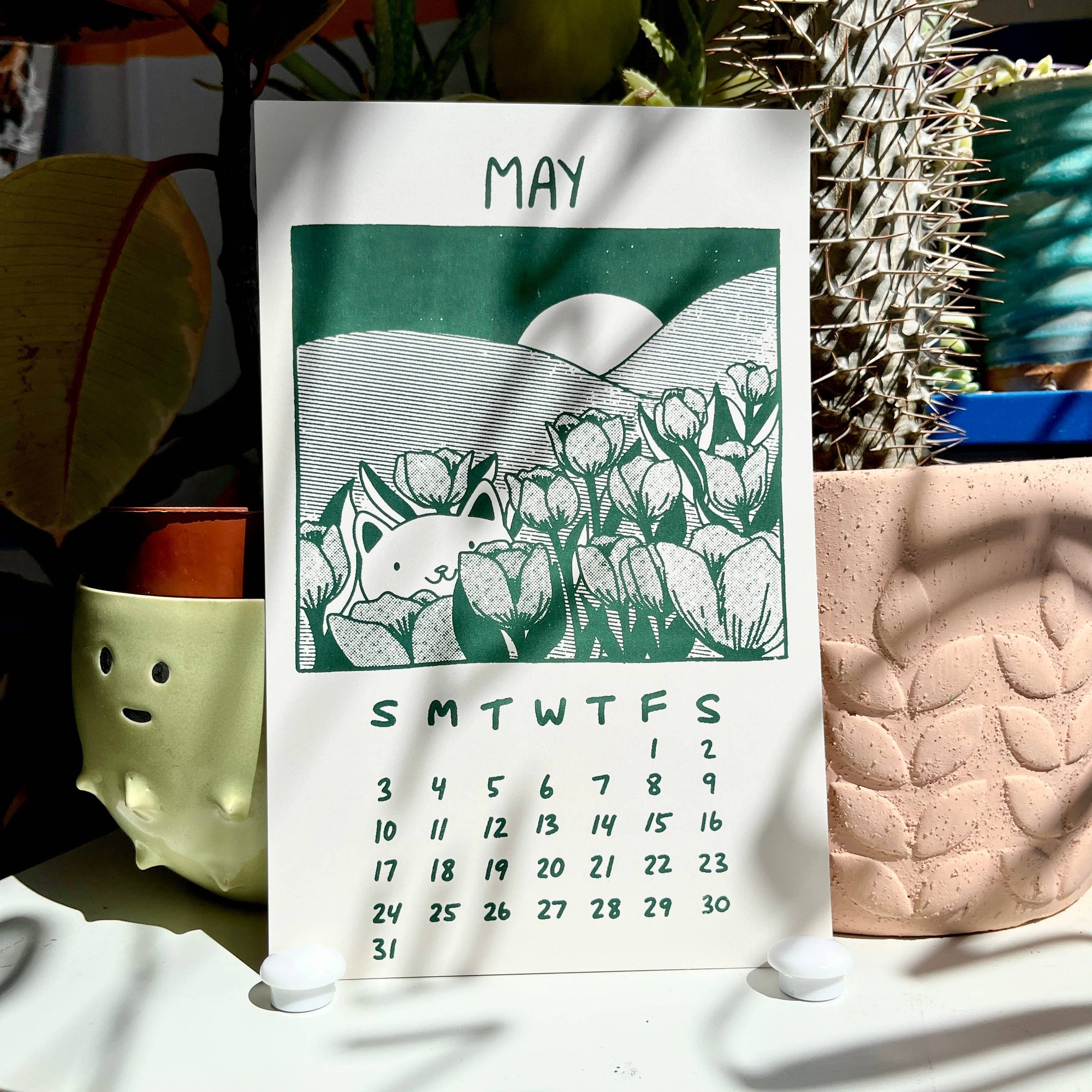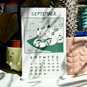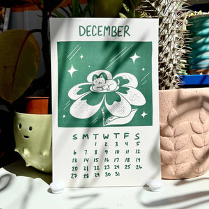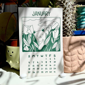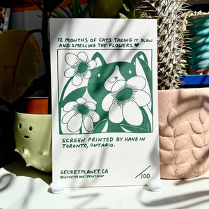 Secret Planet's 2026 calendar features a gang of cats who love to stop and smell the roses :) 12 Months 5.5"x 8.5" Each calendar comes with a binder clip for hanging Designed and hand screen printed in our studio.