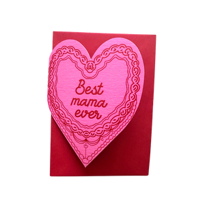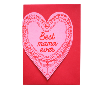 A greeting card featuring a hand drawn retro cake and the words Best Mama ever. Perfect for Mothers Day , new mums & just because. Digitally printed on textured card stock & die cut on Our antique machines. Presented with a C6 envelope in a biodegrable cello. Blank inside.
