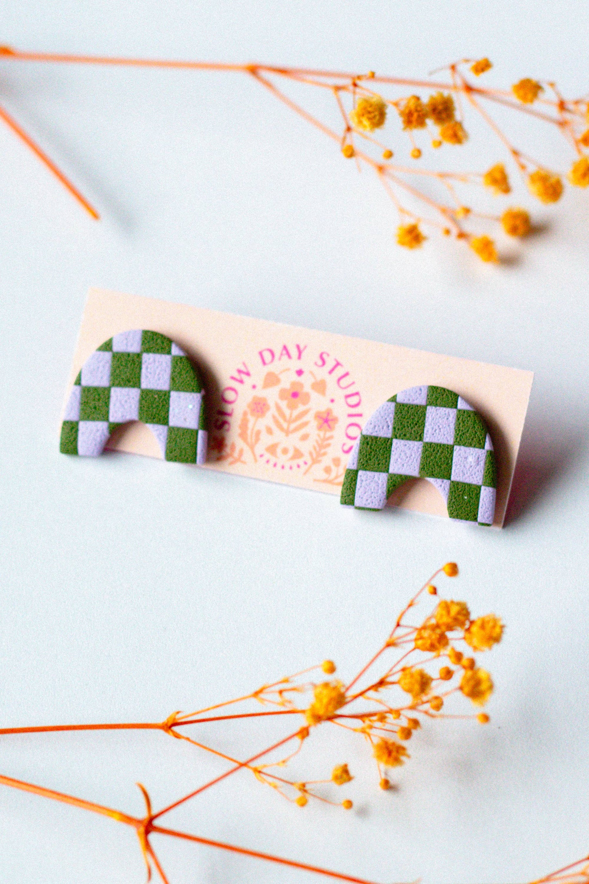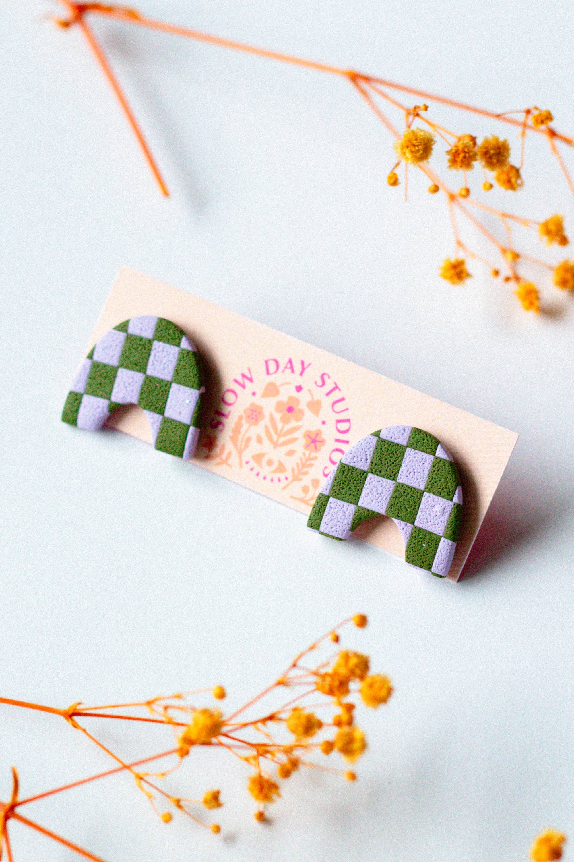Checkerboard Polymer Clay Stud in Olive Green and Purple