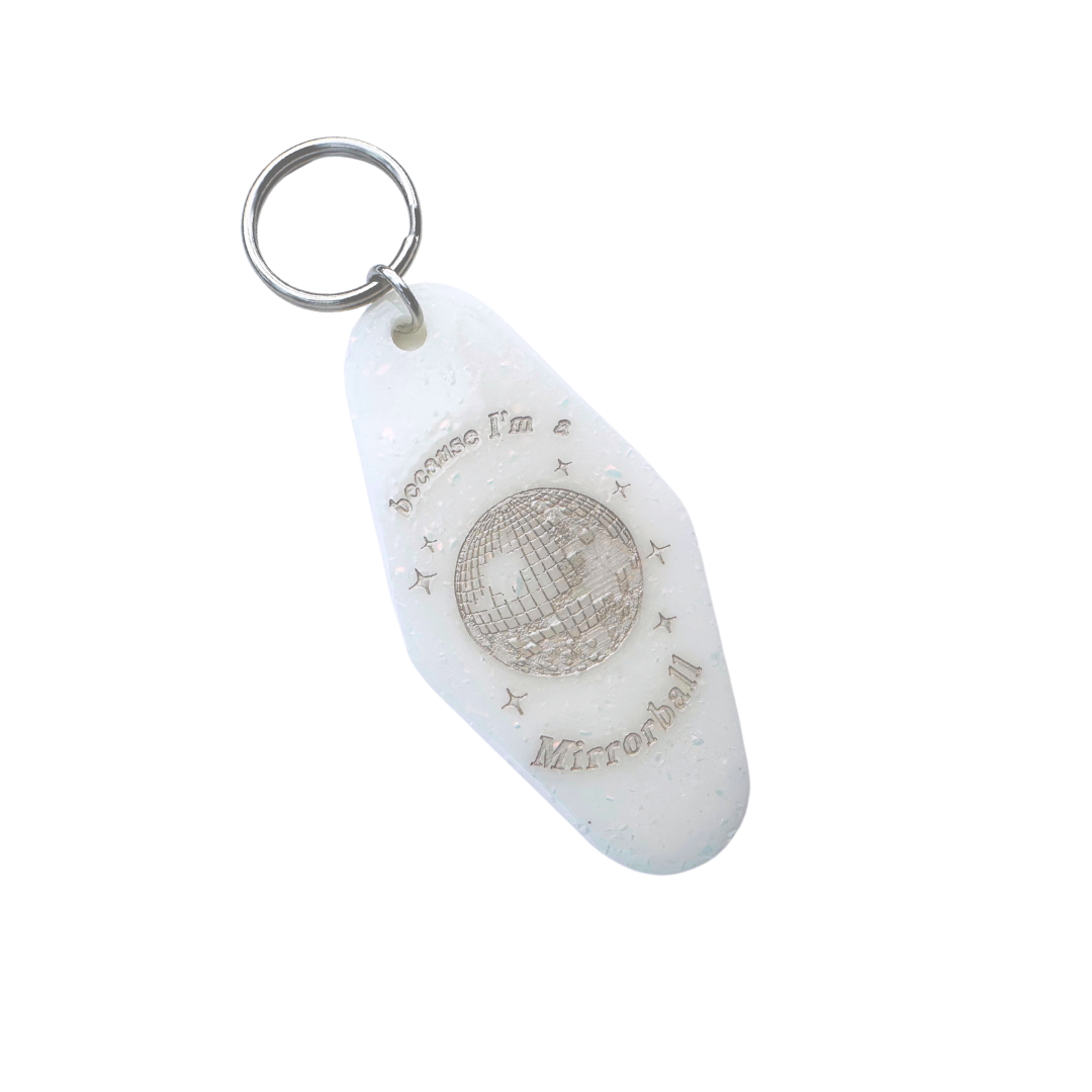 • Measures 3.5" x 1.75" • Iridescent flecks • Silver keyring hardware • Packaged in a cellophane sleeve